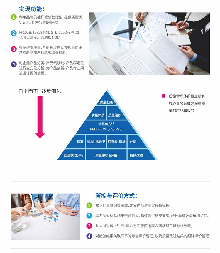 系統(tǒng)特色:實現(xiàn)測試結果自動采集,不良標簽自動打印等,對進料檢驗、制造、驗貨等業(yè)務過程的質量監(jiān)控,基于質量監(jiān)控規(guī)則展開在線預警,同時支持質量改進過程跟蹤管理。