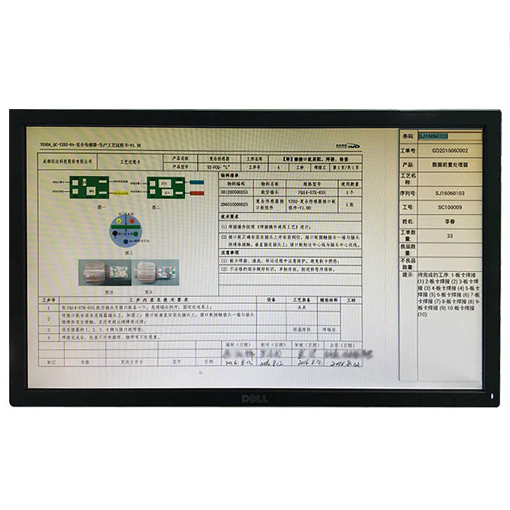 液晶電子看板,采用高分辨率,顯示內(nèi)容豐富,色彩和布局可根據(jù)客戶喜好進行設計,同時可通過以太網(wǎng)/無線網(wǎng)絡將工廠內(nèi)的所有電子看板進行集中管理,并且將實時的生產(chǎn)數(shù)據(jù)上傳到服務器,管理人員在辦公室就可以實時查看生產(chǎn)進度,返修率等數(shù)據(jù)。